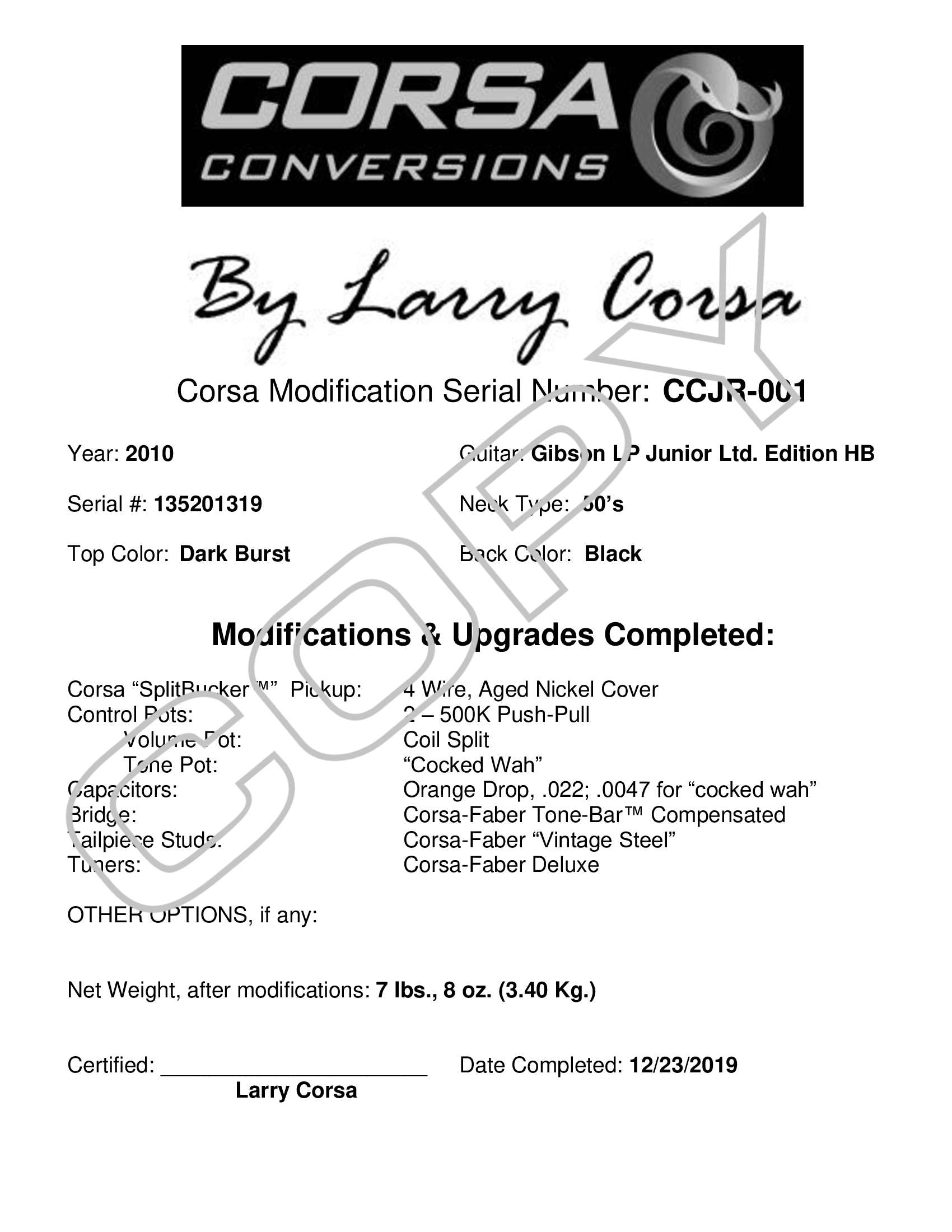 Corsa Conversion – 2010 Gibson LE Les Paul Jr. in Vintage Sunburst – CCJR-001