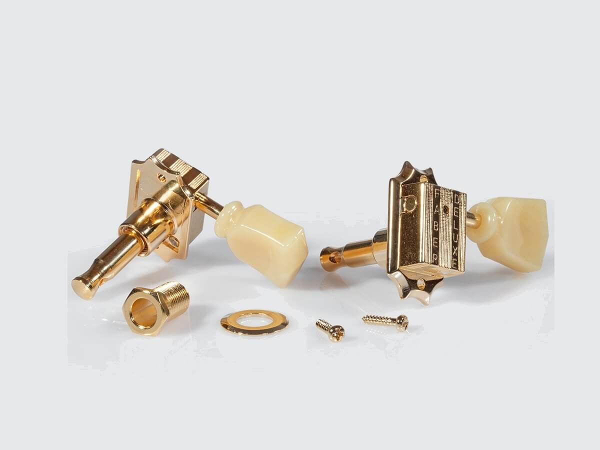 Set of six 3×3 (3 per side) tuners. Solid performance DIECAST high ratio, using hex head screw in bushings instead of press in ferrules, with vintage style pearloid plastic tuning keys, in a vintage cream color – not green! 15:1 gear ratio.